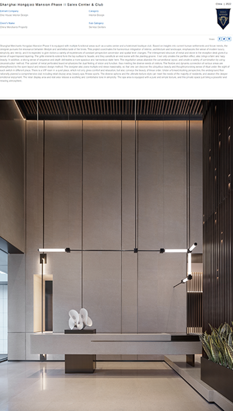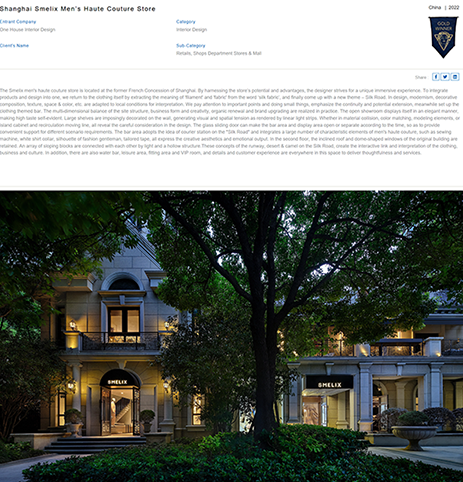✓ 上海招商虹桥公馆二期、上海Smelix仕觅男装高定店——斩获金奖