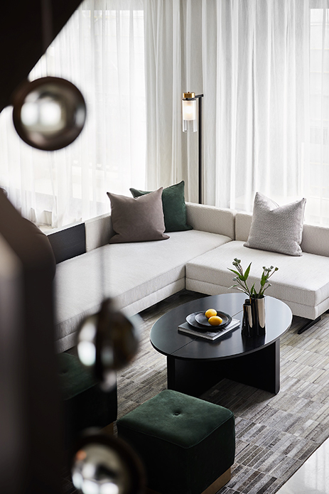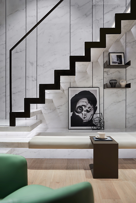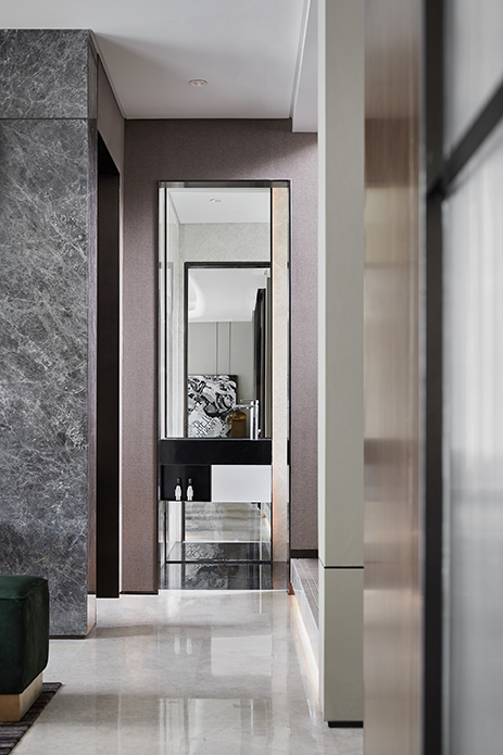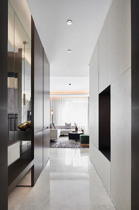 局限在某种程度也是孕育创造力的催化剂。玄关因原始过道较小,内凹的镜面效果加强整体延展性及归家仪式感。右侧墙面则营造洞口,打破视线阻隔,可一窥楼梯间的组合装置,丰富层次感的同时,亦加强了各区的互动与联结。