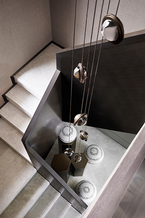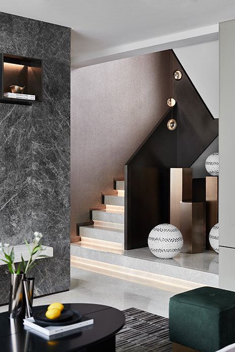楼梯以平台延伸的形态充当踏步的前奏,柱体和球状的组合关系,也延续了积木盒子的概念,在娴熟的结构处理中演绎场域的力量与美感。随一体下垂的吊灯盘旋而上,似乎离幸福也更近了。