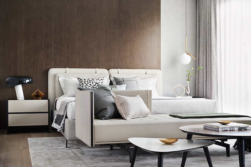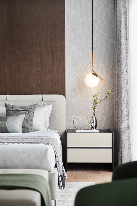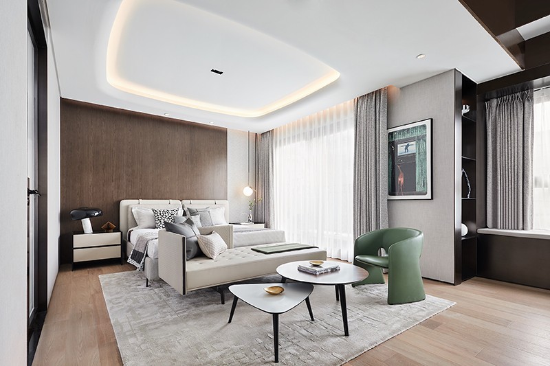 温润的木与柔和的米色调铺陈主卧睡眠区,散发出一种雅致温馨的韵味,藉由皮革、布艺与木质自如融合,予人安心怡然之感。