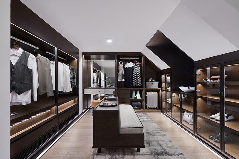 顶部阁楼因势化身为专属衣帽间,实现对闲置区域的最大化利用,也力求功用与美学的完美融合。陈列分区理性而细致,斜顶洞口的开启,及灯带的适宜设置,彰显出细腻的柔情与不俗的品味。