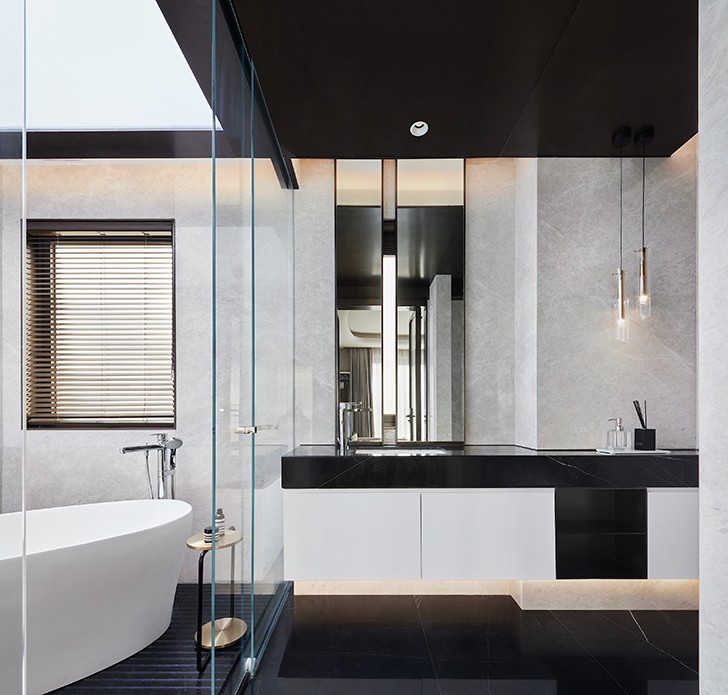 玻璃天井围合出主卫浴室,以上下通透的形式,加强了室内外的交融与对话,渲染出日照光影、夜观星空的惬意状态,显得宁静而美好。