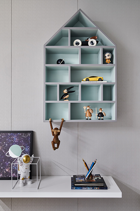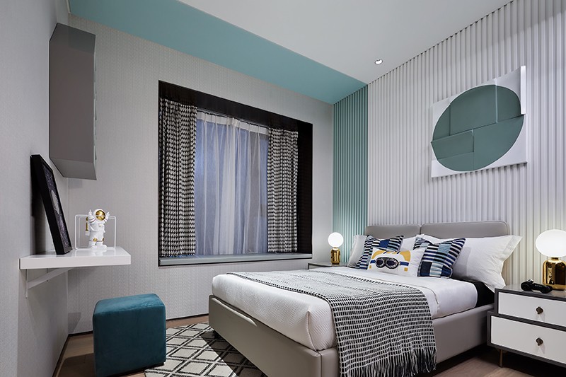 儿童房借由不同的蓝绿搭配呈现出丰富的层次效果,无论是床头柜,还是墙面装置、悬浮小屋,无不流露出对积木拼接的活化运用。构筑起这个欢乐的童话王国,让其搭载孩童稚嫩而精彩的梦,为未来描绘无限畅想。