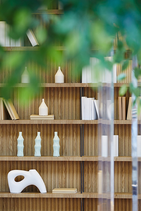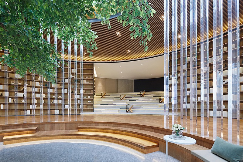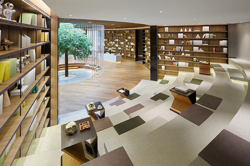 大面积的弧面书架与也与树屋、水吧构成层层包裹,且书架背板沿用木格栅,层板内部暗藏灯带,纵横之间饱含秩序与细节特色。不同主题的书籍分门别类陈列于书架之上,无论成人亦或孩童,总能挑选到自己的心中所爱。