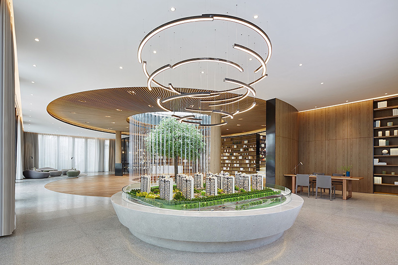 沙盘区再一次延续“圆”状,吊灯萦绕而上,在环环递进中勾勒出云形,进一步充盈自然气息,也映衬出弧线的立体感与力量感。