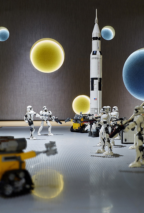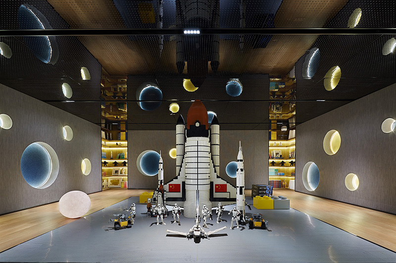 夹层内追求沉浸感的营造,墙面设置大小各异、高低起伏的球体形态,加上顶端不锈钢冲孔板的映射,引导孩童在虚实交织中去探索神奇的星球与未来。