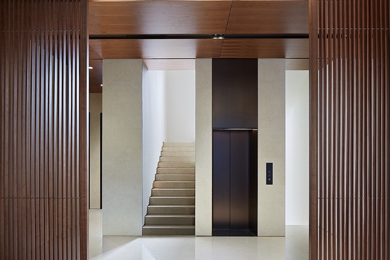 移步换景,直梯包裹电梯一路向上,到达二楼的私密起居空间。在喧嚣城市中,寻一方寸之地寄托本心,尤为重要。为此设计师为家庭成员配置了三个各具个性的卧室套间与一间书房。