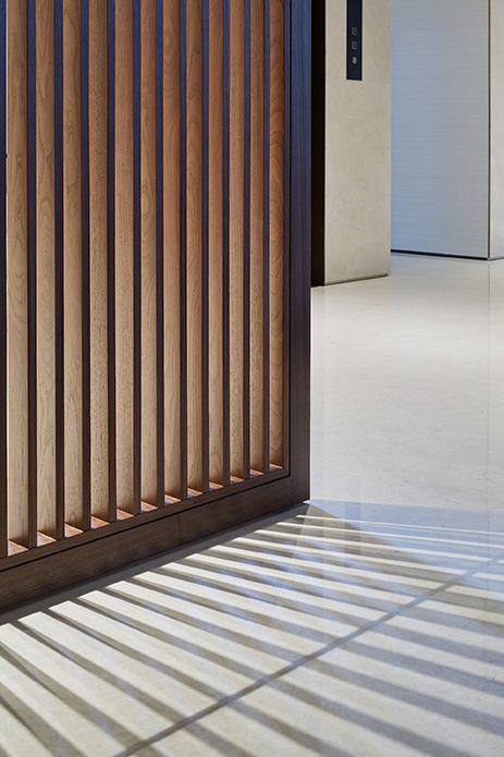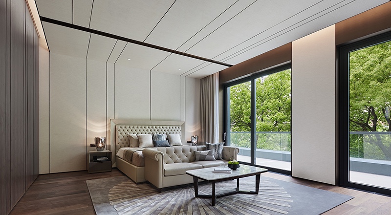 主卧套间用穿透手法连接各区域,由安眠的米色调卧室向沉稳棕木色衣帽间深入,进而踏入极简白的卫浴间。卧室线条细节由立面至顶面延伸,窗景引入,起居生活与自然的联系更趋紧密,让净、简、素的基底更具活力与生机。