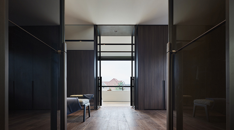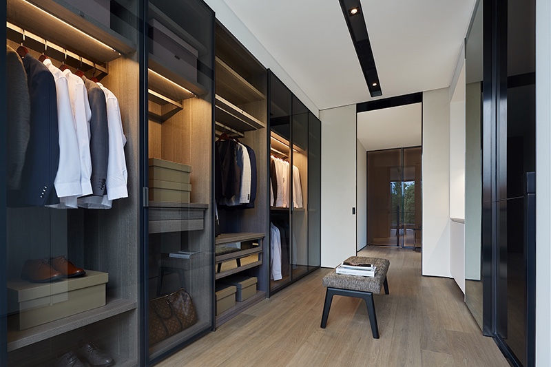 衣帽间、梳妆台在镜面与玻璃的相互映射下,虚实交融,无形中令空间扩容。