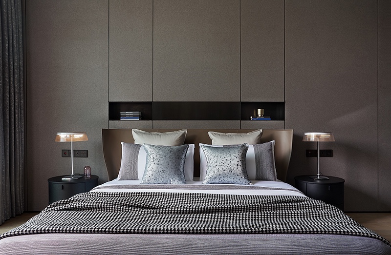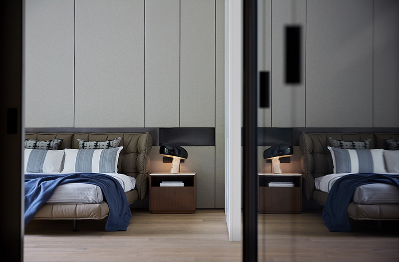 卧室选用单纯的灰调与温和的材质,散发安宁恬静的气息,忠于空间的本质功能。