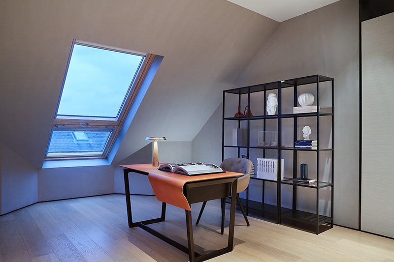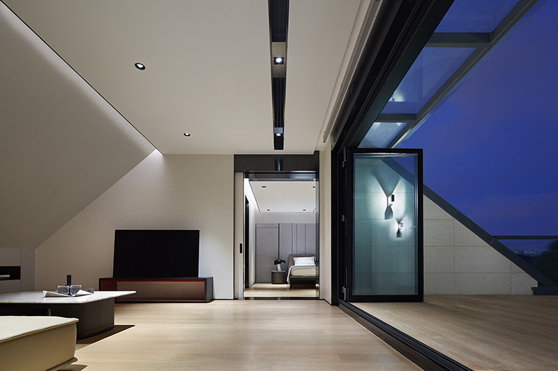 三楼设有书房、客厅、客卧、露台及榻榻米等区域,注重赋予其更多灵活可塑性,也为未来生活的后续需求留有发挥余地。露台与客厅开放互联,切面视觉让空间框架彰显趣味。斜顶开设天窗,以柔和方式留住适宜的照度,使书房更显宁静、祥和之气。
