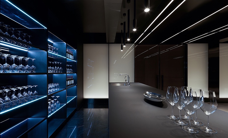 地下一层为休闲娱乐空间,品酒区、台球室、影音室、乒乓球室一应俱全,满足业主多元化的功能需求。台球室与品酒区一体而成,经由俊朗的材质强调线条垂直感以及映射延展性,塑造出丰富的立体构成。