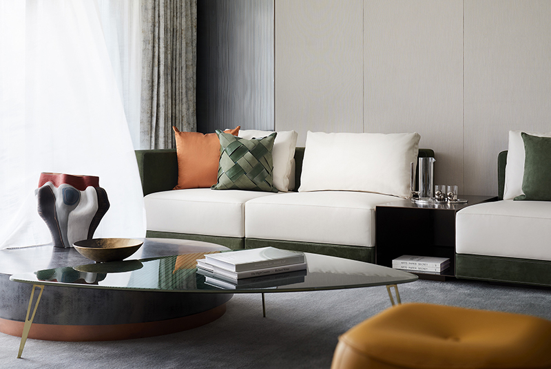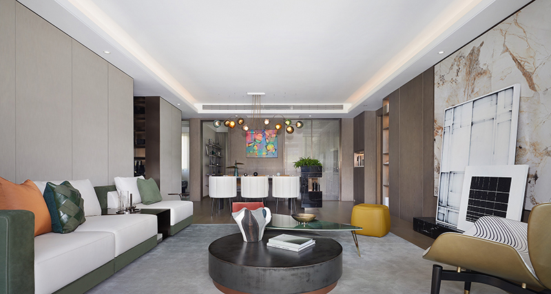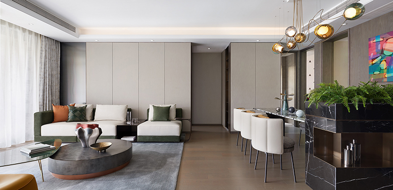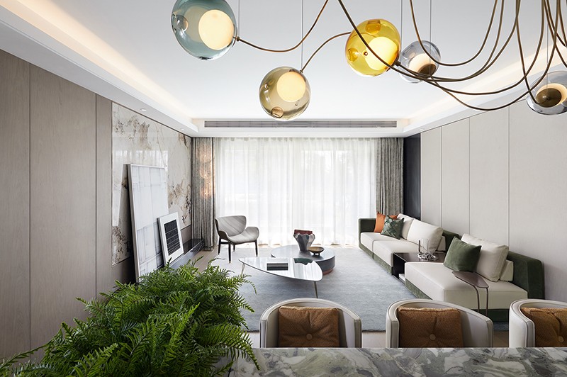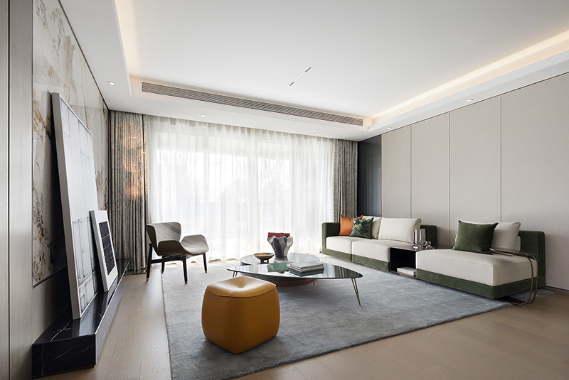 “不同的生活态度造就不同的空间模式,不同的情境营造也能引导不同的生活方式。生机绿意是都市居所中珍稀的,格调美学也是为人所挚爱的,我们以此为切入点,用现代国际风范作基调,于绿野之境构建人、自然、艺术品的共生对话,在感性与理性交融间惬意遨游。”设计师方磊娓娓道来其主旨意图。