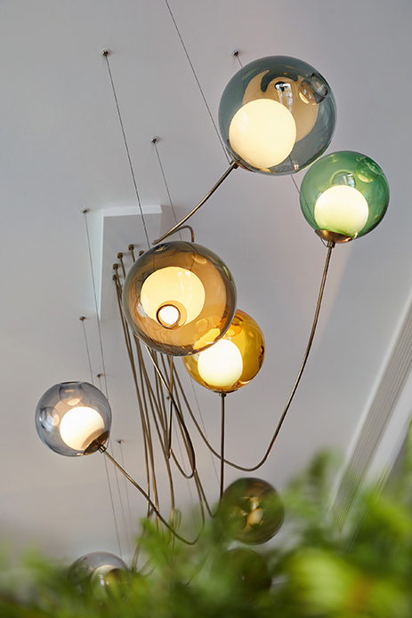 以开放松弛的面貌邂逅归家之旅,入户的第一视觉,便能直观感受到绿意气息。放眼向上,绚丽多姿的吊灯恰如装置艺术一般,以奔放律动的身姿开启热情的迎接。