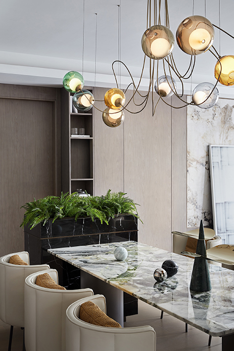 餐厅所处的位置,于某种意义而言也是枢纽中心。除去要规划好它与各功能分区的动线关系之外,对其在入口处或是客厅等各个视角的呈现也需要慎重考量。冷翡翠桌面纹路饱满,充满张力,恰如其分的与吊灯上下辉映,显得立体且完整。