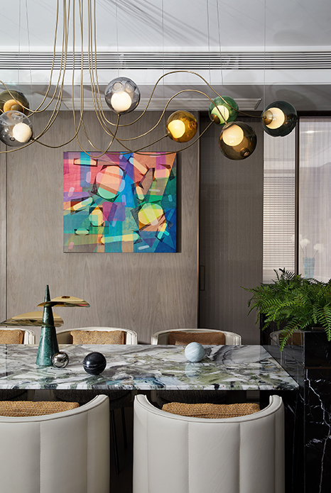 室内各种色泽的运用,似乎都可从餐厅背景墙上的画作《光的呈现》里得以溯源,以抽象的笔触描绘出具象的有序与变化,也增添一抹瞩目且欢畅的光芒。目之所及,错落有致的关系、直线弧度的碰撞、刚柔兼济的包容,共同助力艺术的高雅与生活的烟火气和谐交融。
