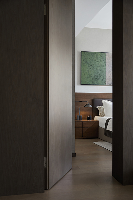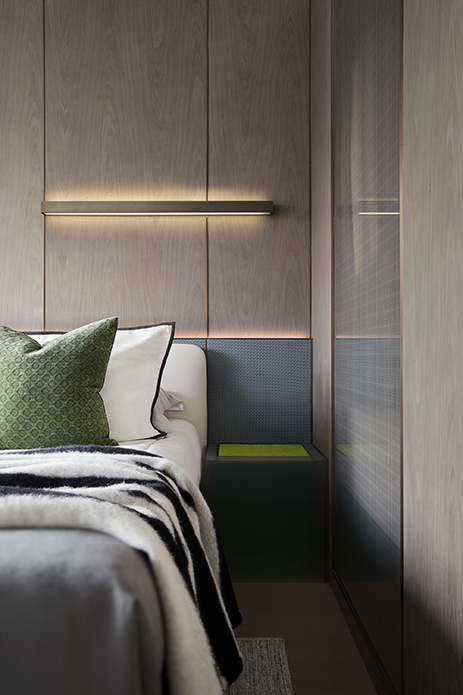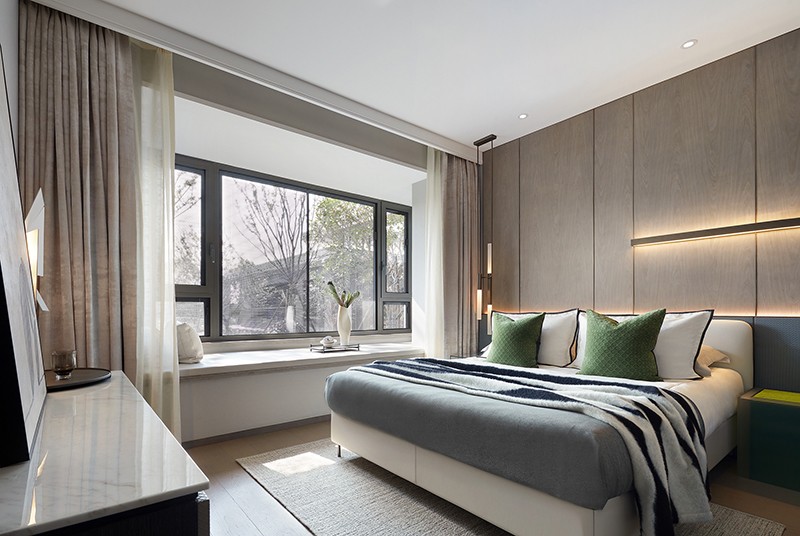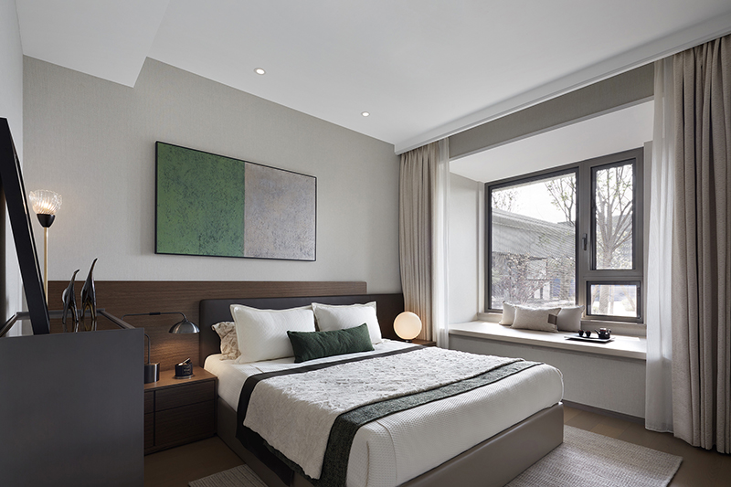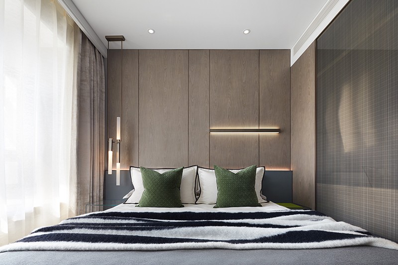 次卧同样遵循利落简洁的手法,块面的叠层之感从床品蔓延至床头背板,在变化与衔接中形成碰撞,勾勒出多维的层次。看似随性,实则有内在的逻辑关联。
