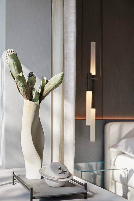 床头柜也摒弃常规,在一侧选用太空泡棉“云雾系列”,借物抒情,将材质与颜色融合在诗意的微妙情绪中,流露出对自然的向往以及无尽宽广的追寻。另一侧则以通透轻盈的体量、鲜明可感的纹理,让彼此平衡互补。二者可谓卧室里的破局亮点。