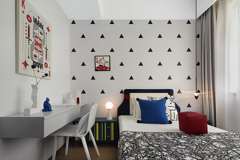 基于孩童的天性与视角出发,儿童房从“纸牌游戏”中汲取灵感,图案、造型、装饰皆合理散落其中,缤纷明亮的色彩点缀,也渲染出游戏玩乐的氛围,赋予这一方小天地别样的趣味与活力,同时也能对小主人进行心智和情感上的启蒙。